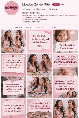 Het Instagram-account deelt eerlijke, ongepolijste beelden, quotes en dilemma’s die het perfecte moederschapsbeeld doorbreken. Door reacties uit te schakelen ontstaat een veilige plek waar moeders zich herkennen in elkaars ervaringen en eigen verhalen kunnen insturen.